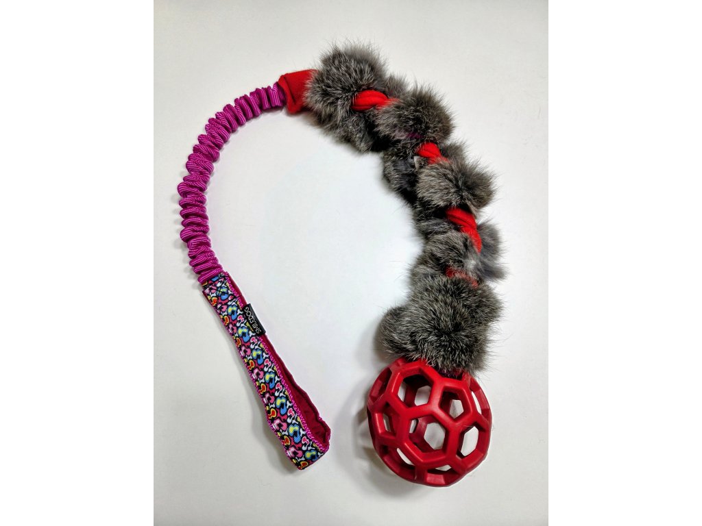 Přetahovadlo je vyrobeno z pravé králičí kožešiny. Velikost králičí části cca 30cm, amortizer cca 25cm, rukojeť je podšitá softshellem.