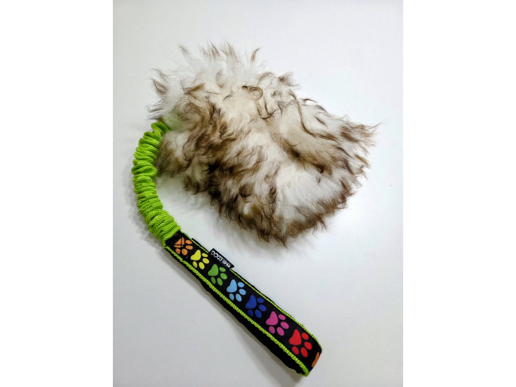 Přetahovadlo je vyrobeno z pravé ovčí kožešiny. Velikost ovečkové části cca 20x10cm. Délka amortizéru cca 25 cm, rukojeť je podšitá softshellem.