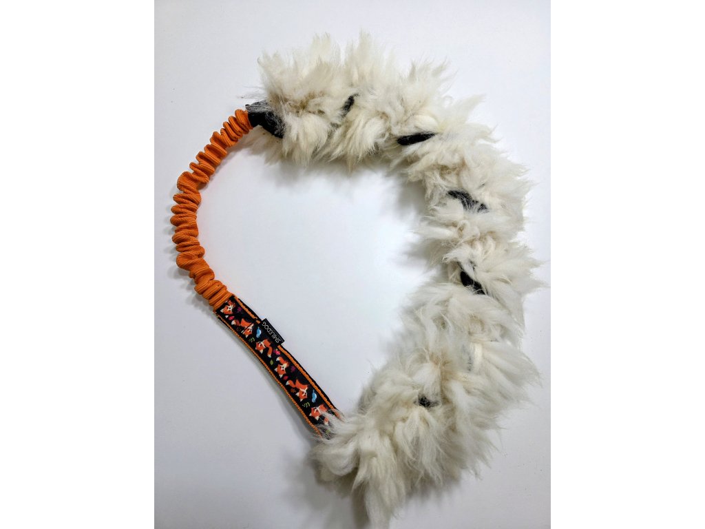 Přetahovadlo je vyrobeno z pravé ovčí kožešiny. Velikost ovečkové části cca 60cm, amortizer cca 25cm, rukojeť je podšitá softshellem.