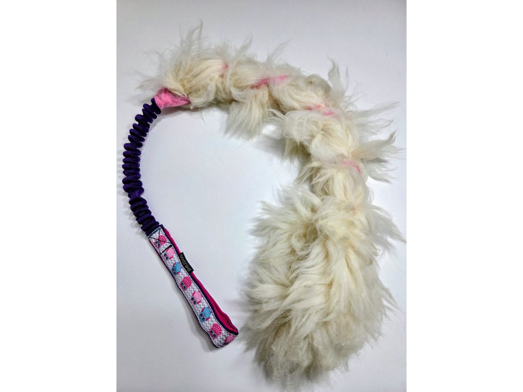 Přetahovadlo je vyrobeno z pravé ovčí kožešiny. Velikost ovečkové části cca 60cm, amortizer cca 25cm, rukojeť je podšitá softshellem.