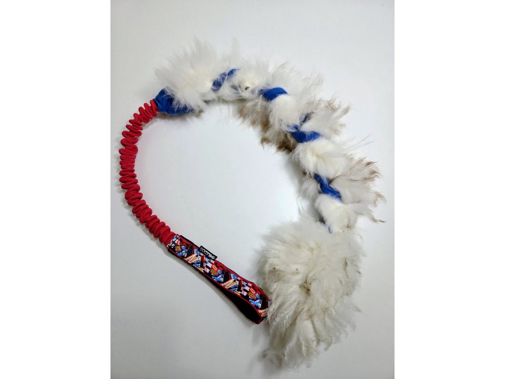 Přetahovadlo je vyrobeno z pravé ovčí kožešiny. Velikost ovečkové části cca 60cm, amortizer cca 25cm, rukojeť je podšitá softshellem.