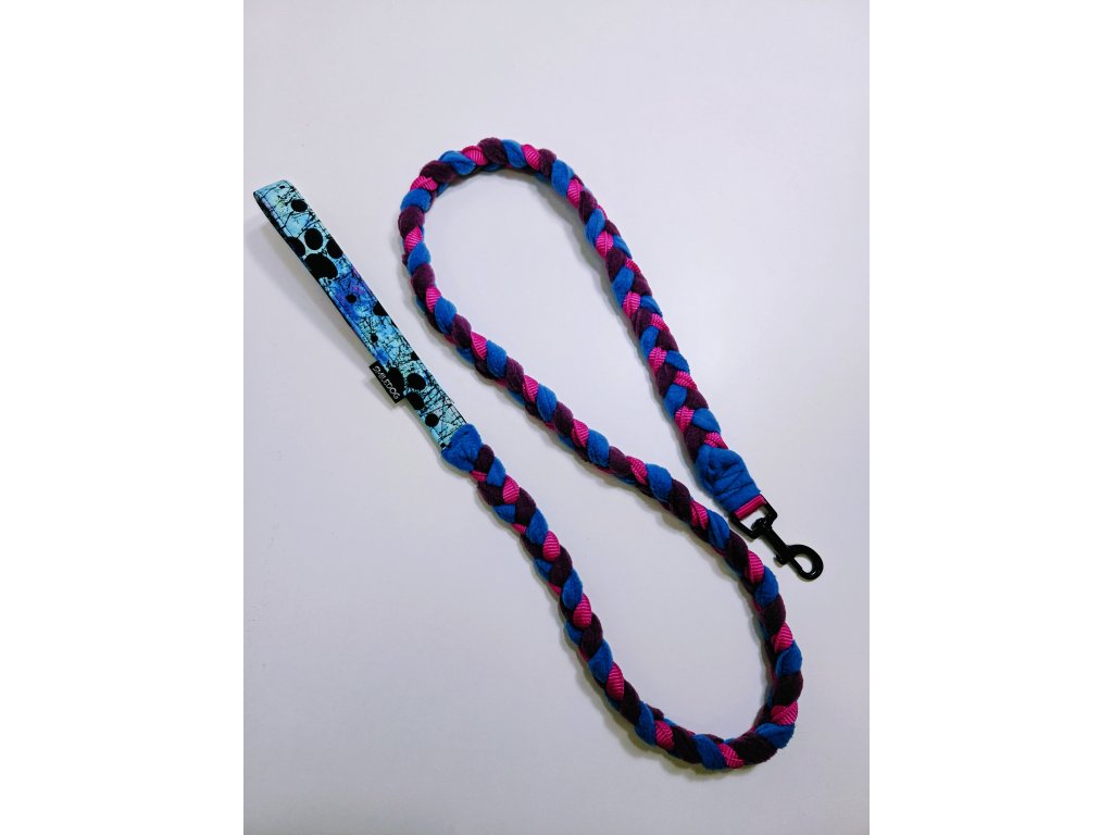 Zapletené vodítko s popruhem a fleecem. Šířka vodítka 2cm a délka 150cm. Karabina střední a velký pes 61mm.